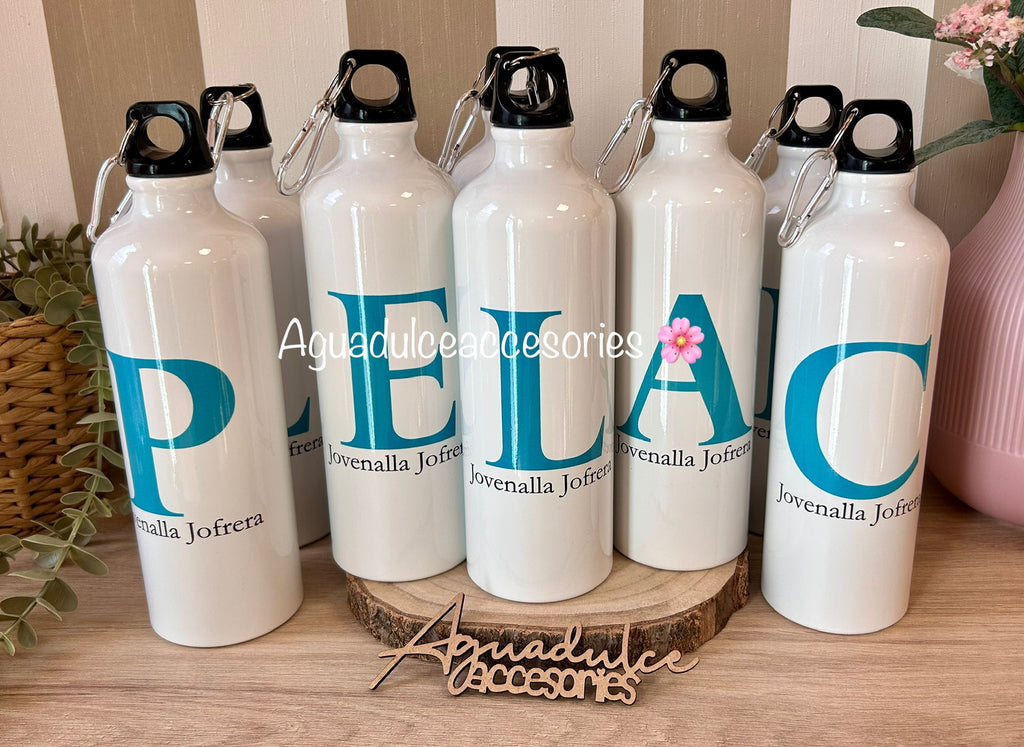 Personaliza esta práctica botella de agua con nombre y letra inicial, ideal para uso diario, escuela, deporte o como regalo especial.